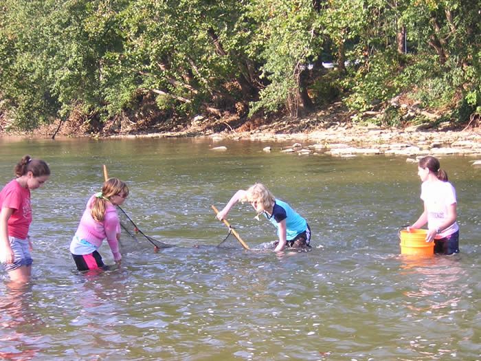 Seining and Fish Study (all grades) – Working in small teams, students help pull the seine net out of the river and retrieve whatever they’ve caught. Depending upon the students’ height and site location, they may get wet up to their knees or waist. Students examine fish adaptations using aquariums stocked with “the catch of the day” collected by the children during the seining activity.