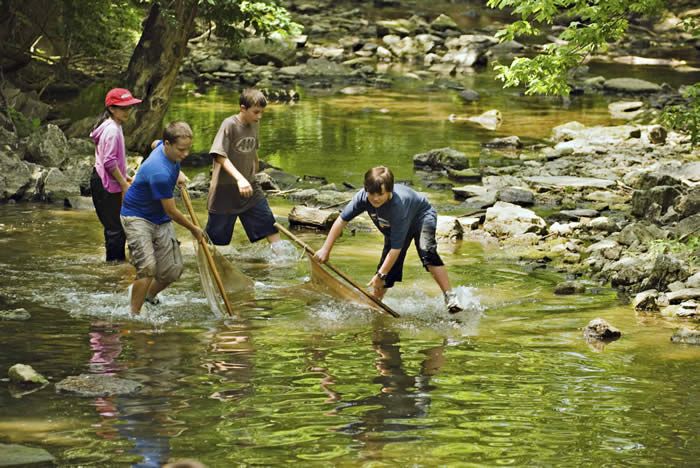 Seining and Fish Study (all grades) – Working in small teams, students help pull the seine net out of the river and retrieve whatever they’ve caught. Depending upon the students’ height and site location, they may get wet up to their knees or waist. Students examine fish adaptations using aquariums stocked with “the catch of the day” collected by the children during the seining activity.